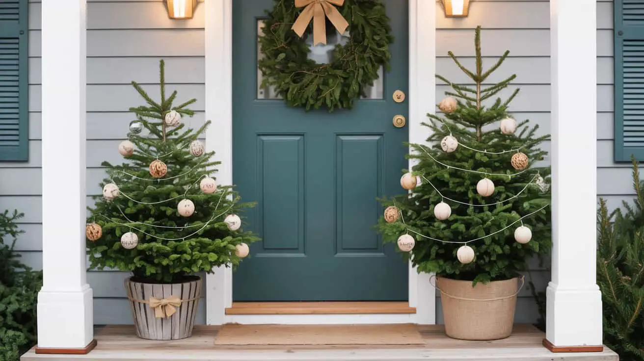 You don’t need a full-size tree to make a big impact. Two small potted evergreens—one on each side of the door—can look just as festive, especially if you decorate them with tiny baubles or simple wooden ornaments.