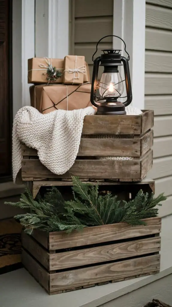 Stacked wooden crates are a ridiculously easy way to give your front steps that farmhouse feel without spending much. Try layering one crate upright and another on its side—then fill them with pine branches, a small lantern, a cluster of red berries, or even a few wrapped “fake” presents in brown paper and twine. Pop a chunky knit blanket over one edge for that cozy layered look, and you’ve got instant charm.