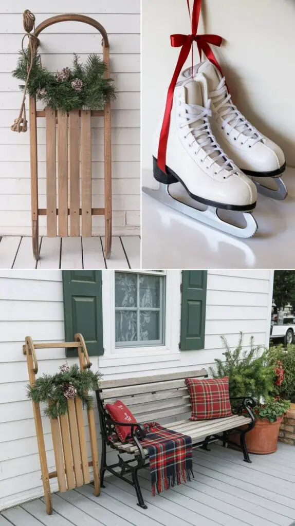 If you’ve ever stumbled on a dusty sled at a flea market or an old pair of skates in the attic, don’t leave them there—those are front porch gold. Lean the sled up against one side of your door and wrap a strand of faux garland or bells around it. Then hang the skates by their laces over the top, maybe stuffed with a bit of greenery if you’re feeling extra.