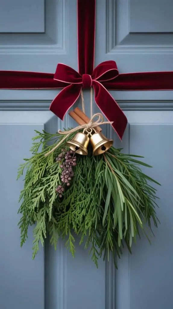 Then, use smaller strands to tie together a bundle of rosemary or eucalyptus and hang it from the doorknob. Add a set of jingle bells or even some cinnamon sticks tied with twine. It feels thoughtful and festive without being overdone. Plus, it smells incredible every time you open the door.