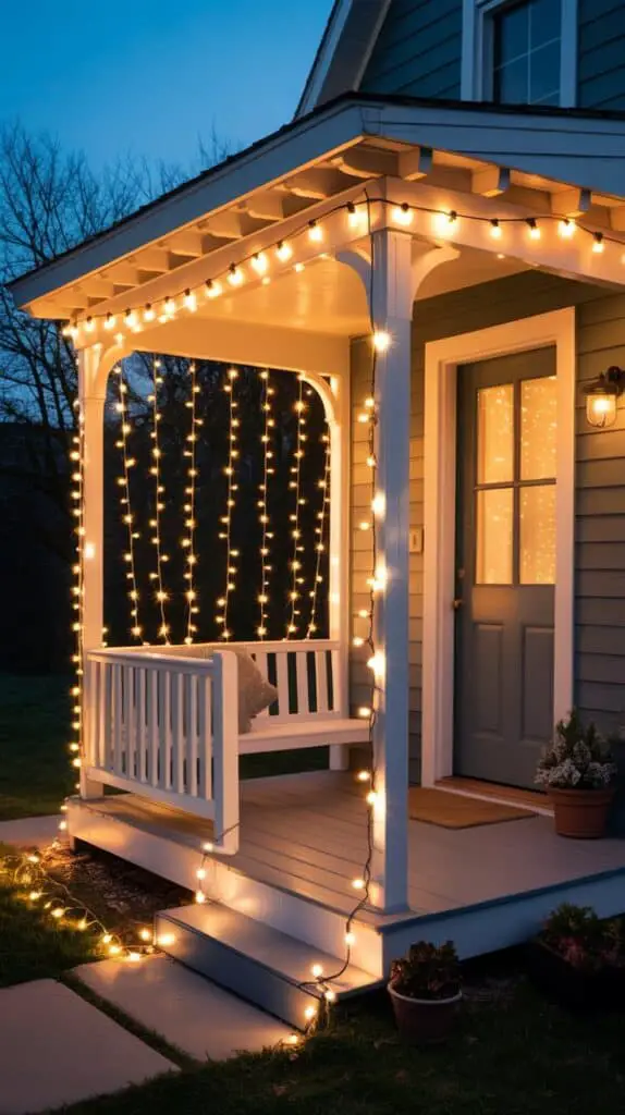 This one’s a classic for a reason. String lights—especially the warm white kind—can turn a regular porch into a glowing winter hangout. Drape them across the ceiling beam, around the doorframe, or twist them along the porch railing. You don’t need a whole lighting scheme, just one or two well-placed strands will work wonders.