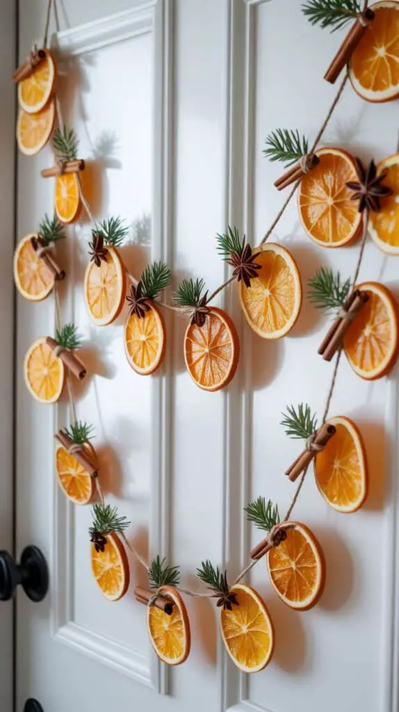 Slice your oranges thin and dry them in the oven (low temp, around 90°C, with the door open a crack). Once they’re leathery and slightly golden around the edges, thread them onto twine with cinnamon sticks, little pine sprigs, or even bits of star anise if you’re feeling fancy. Tie little loops every so often to give it shape.