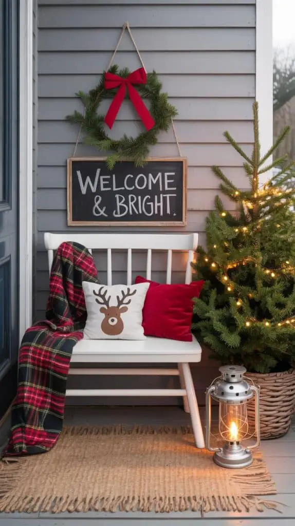 If you’ve got a small bench, stool, or even an old wooden chair you’re not using inside, bring it out. A little porch seating can make the whole space feel lived-in and intentional. Drape a tartan blanket over one side, add a holiday-themed cushion or two (reindeer or red velvet works great), and tuck a mini tree or lantern nearby.