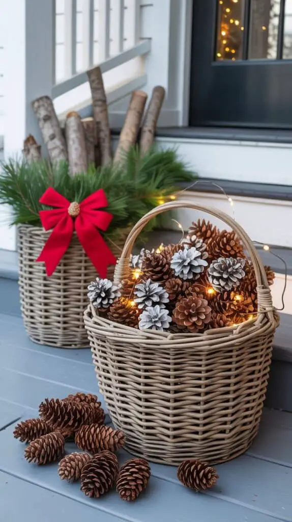 Baskets aren’t just for summer. A few rattan or wire baskets on the porch filled with pinecones, chopped logs, or bundles of sticks instantly makes it feel more wintery. If you’re feeling crafty, add in a few baubles or wrap a red bow around the basket handle.