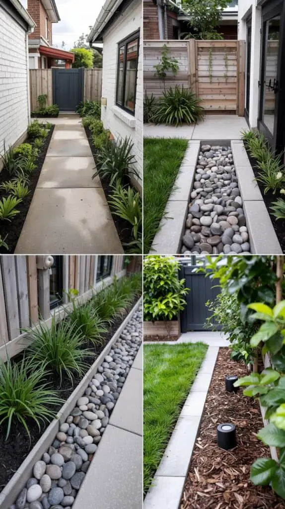 This design is especially good if your side yard is heavily trafficked (kids, pets, bin dragging, emergency garden escapes). It’s strong, stable, and handles all weather like a champ. If you want to get very fancy, you can stain the concrete a soft warm tone—or just keep it plain and add interest with lighting and plants.