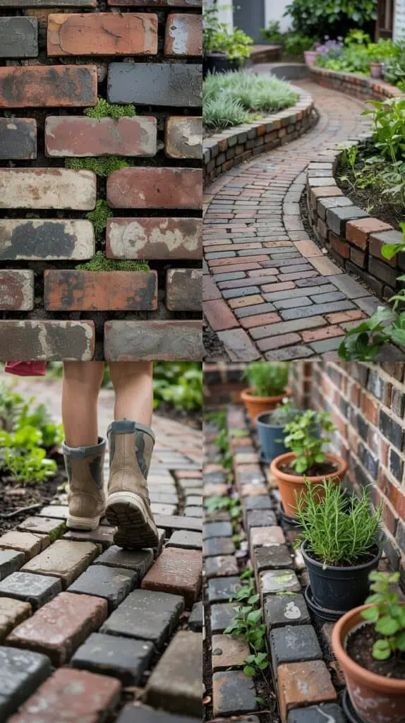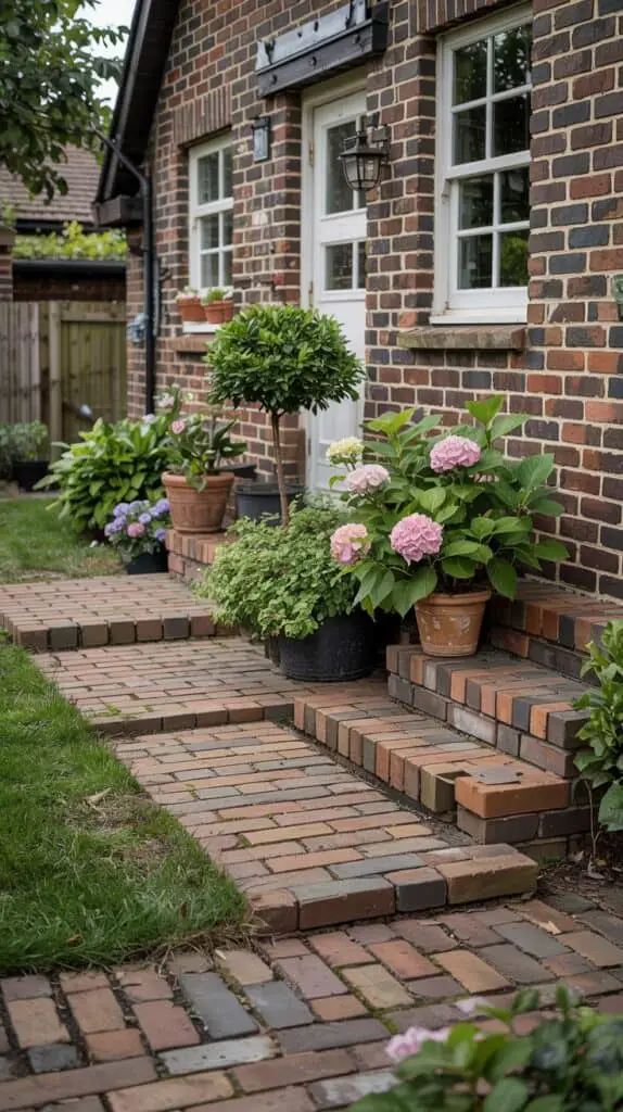 Lay them flat in a basket-weave or herringbone pattern for a traditional look, or space them out irregularly if you’re going for that wild English-cottage-meets-modern-family-garden vibe. The bricks will settle and shift a little over time, but that’s half the charm. Add a couple of potted hydrangeas or ferns nearby, and you’ve got yourself a front-to-back walkway that feels lived-in and loved.