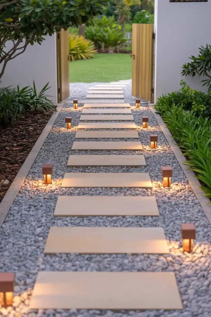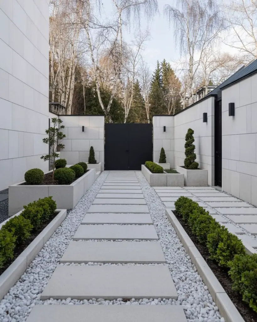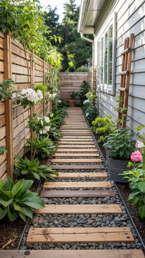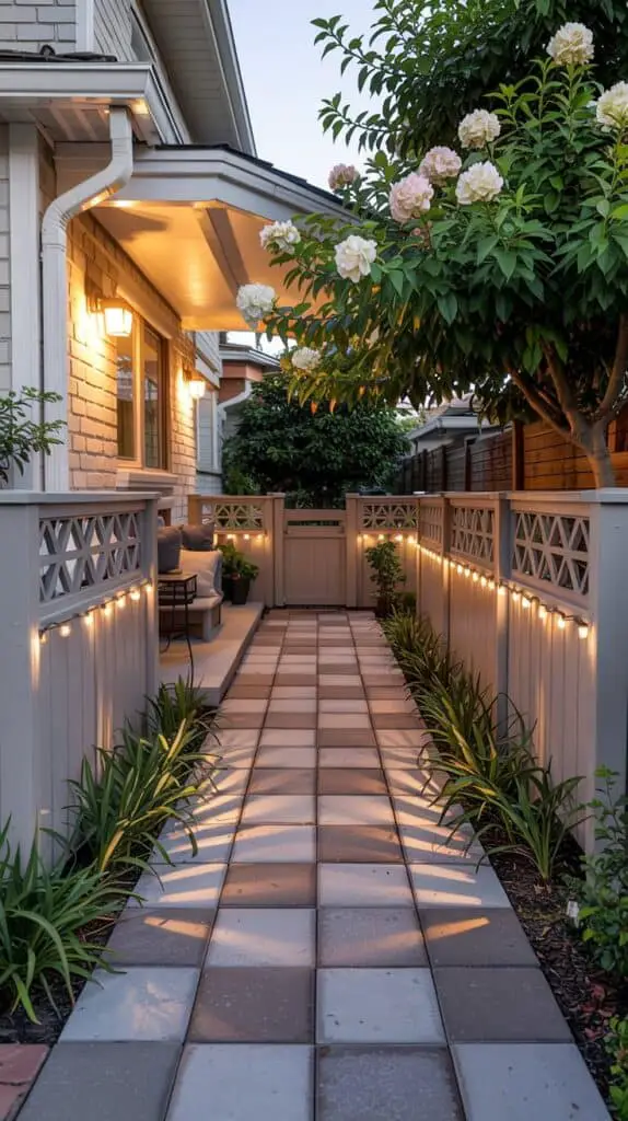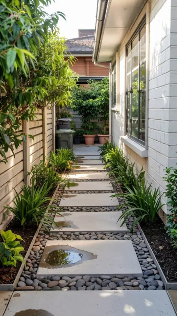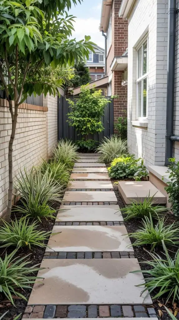 Right—this one’s a bit of a showstopper. If you’ve got a longer side yard or walkway that leads to a garden, seating area, or even just the back gate, consider making it a full experience. Use large modern pavers in a neutral tone (grey or tan always works), and line one or both sides with a low decorative fence or screen.