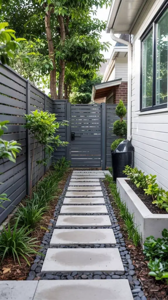 Now pair that with dark horizontal slat fence panels running the length of your side yard. Instantly you’ve created a space that feels intentional, not accidental. Like the path belongs there. You could even add a slim raised bed along one wall or a trellis for climbing greenery to soften the lines.