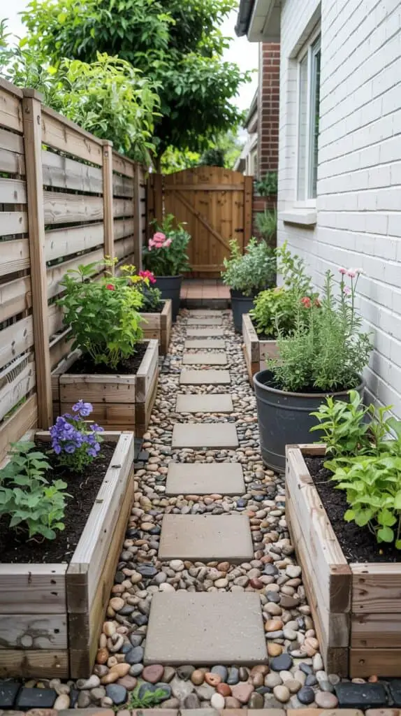 If your side yard is a bit of a blank slate—or let’s be honest, a narrow strip of mud and regrets—then planter boxes are a game-changer. Build or buy a few raised wooden or metal planters and place them neatly along one side of the walkway. Then fill in the walking space with small white or grey pebbles, plus a few square stepping stones for balance.