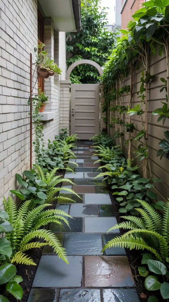 For a side path that makes a bit of a statement, try using long narrow slate tiles. They’re dark, moody, and look absolutely stunning next to greenery. I once saw this done at a small city home where the side yard was barely wider than a garden hose—but it felt like a rainforest path.