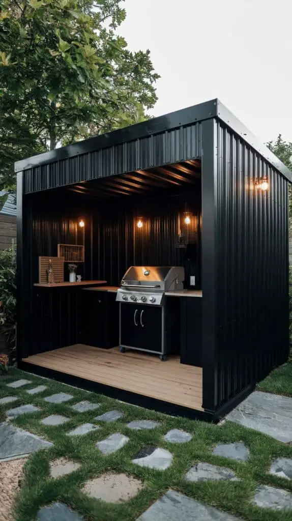 The black shed look has become a modern design favorite, and it works perfectly for a BBQ setup. Painting the shed black or using black metal siding gives it that stylish studio shed vibe—minimal but bold. Pair it with warm lighting and a wood deck floor, and suddenly it feels like a backyard kitchen straight from a design magazine. The grill can be built into a counter inside, with storage cabinets on either side.