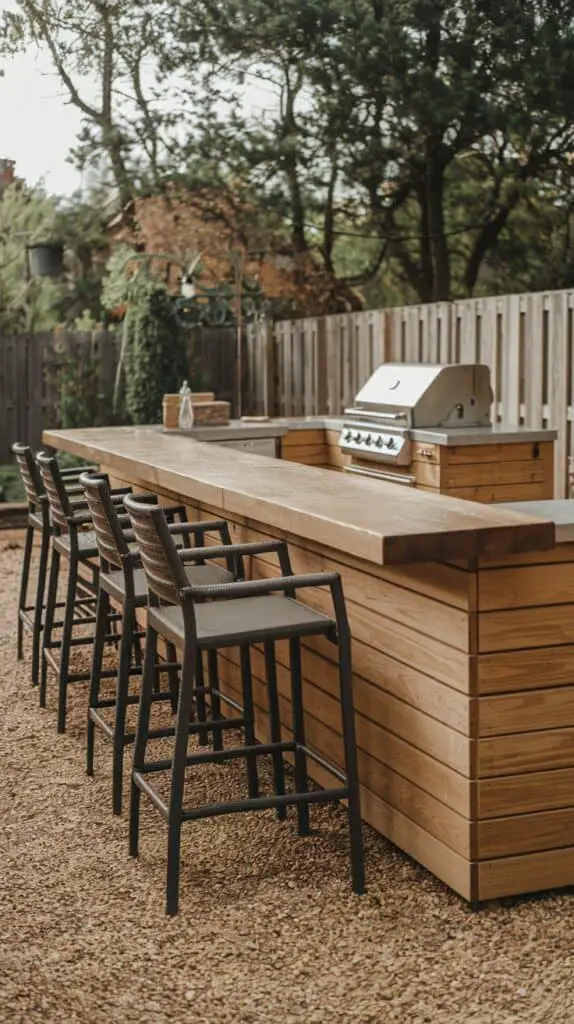 This backyard bar and grill idea works beautifully in autumn, especially if you add a fire pit or patio heater nearby. The whole space becomes not just about cooking but about connection, even on brisk evenings. It’s the kind of design where you can imagine hot cider mugs sitting on the counter right alongside your BBQ platters.