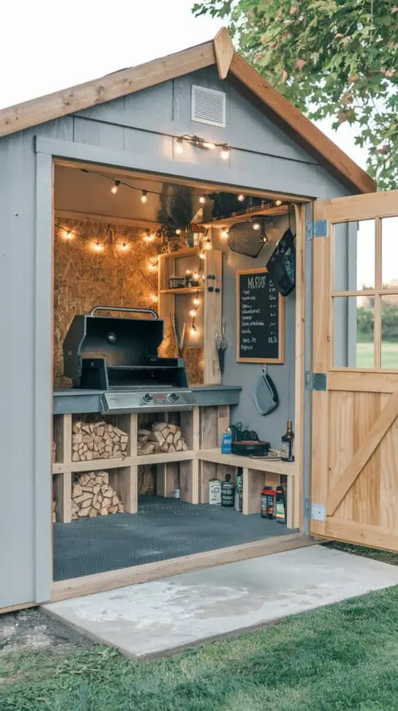 Sometimes the best BBQ shed ideas don’t require big renovations but simple touches that change the whole vibe. Add a small lean-to roof over your grill, tuck in a couple of chairs, and then string warm fairy lights across the space. Suddenly, even a cold evening feels inviting.