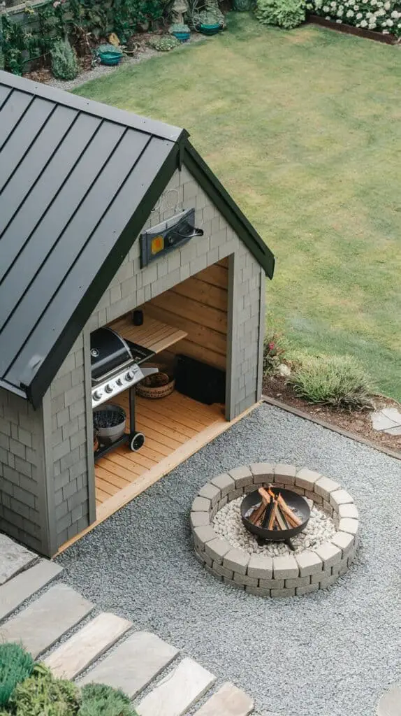 If you love a more polished look, go for a full outdoor kitchen design built into your shed or shelter. This isn’t just a BBQ grill tucked under a roof—it’s a setup with countertops, maybe even a sink, storage drawers, and a mini fridge if you want to get fancy. In autumn and winter, this type of backyard kitchen makes life easier because you don’t have to run back and forth to the house for supplies.