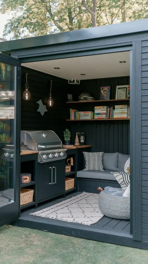 Add a rug, cushions, and maybe even a little shelf with board games or books. It’s not just cooking—it’s hanging out. A black shed design works especially well here, giving it that contemporary look that feels stylish even when it’s really just your backyard. In autumn and winter, the enclosed space becomes the cozy heart of the garden.