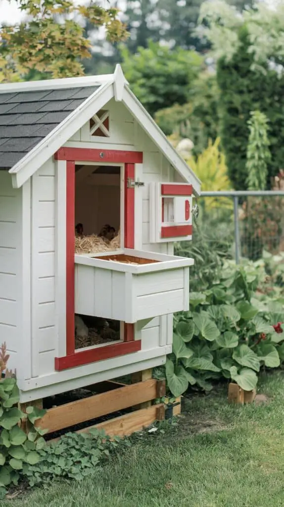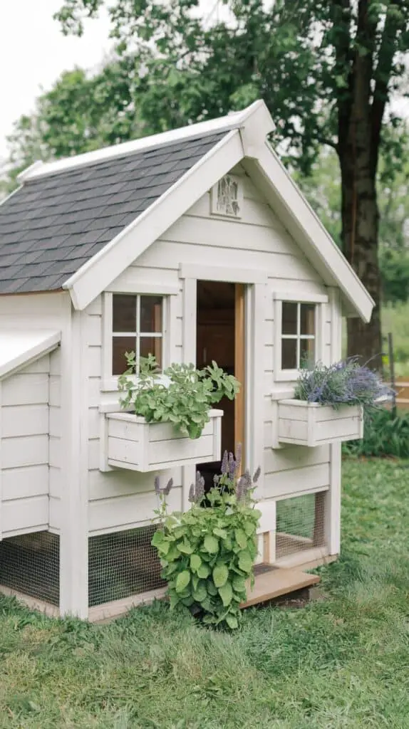 There’s something undeniably charming about a coop that looks like a tiny country cottage. Think white wood siding, pitched roof, and built-in flower boxes under the windows. These coops add curb appeal and keep your hens cozy. You can tuck a few herbs like lavender or mint near the entry to discourage pests and create a fresh-smelling little hen haven.