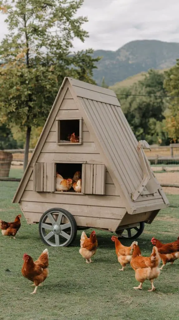 Great for families who want to give their hens fresh ground often without turning the entire yard into a mud pit. These triangular or A-frame coops have built-in wheels or sled-style bases that make them easy to drag to a new spot every week. Bonus: You don’t need a full run because the coop and outdoor space are one piece. Easy DIY win.
