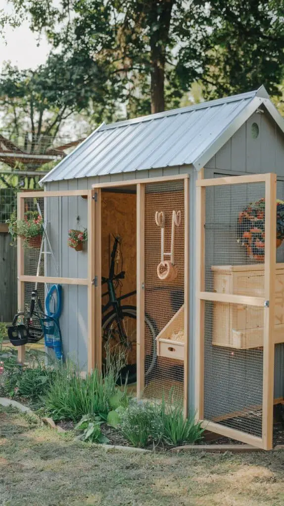 Why build two separate structures when you can design one that’s half shed, half chicken house? Divide a simple backyard shed in two: one side for your rakes, gardening gear, or even bikes, the other side for your hens. A mesh interior divider and double doors on both ends keep everything ventilated and accessible.