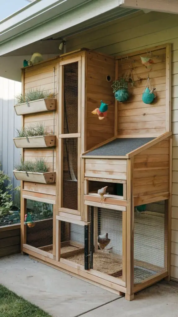 No yard? No problem. This vertical coop design works on patios or in tiny gardens. Stack a small roosting box above a narrow chicken run with side mesh panels. Use reclaimed wood or weather-treated pine, and hang planters or chicken-safe toys along the side. Just make sure the base has a tray or board to protect your flooring.