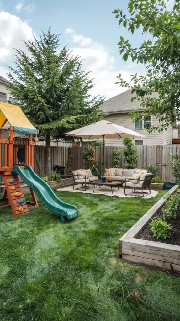 This kind of layout is ideal for suburban families because it satisfies the adults (you still get your cozy space), the kids (they get their play space), and the yard itself (it finally feels intentional). It’s also great for backyards with no fence, because you can define zones with plants, low shrubs, or even raised beds rather than walls. And honestly — a yard with purpose just feels nicer.