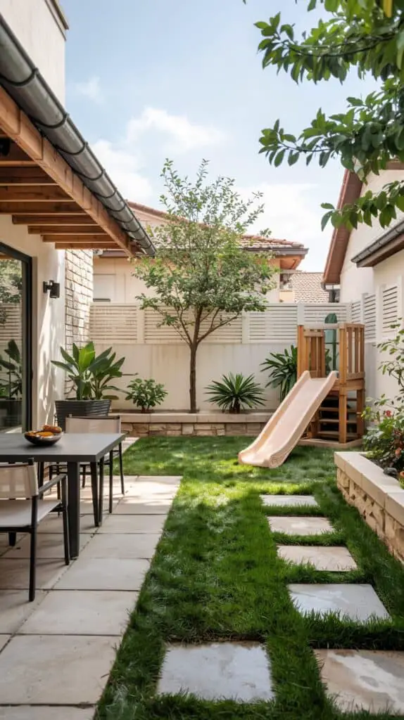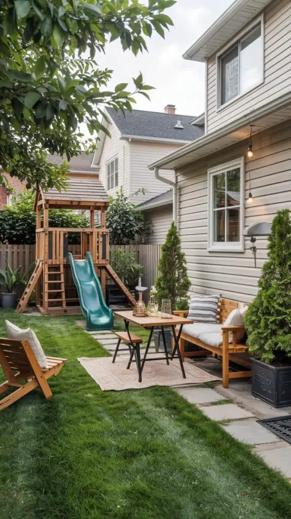 Imagine the main lawn in the centre, the play structure tucked against the far fence, and then a small patio running alongside the house. It’s narrow but cozy. Add a small table, a bench with cushions, and string lights along the wall. Kids can play on the slide while you sit just a few steps away enjoying fresh air.