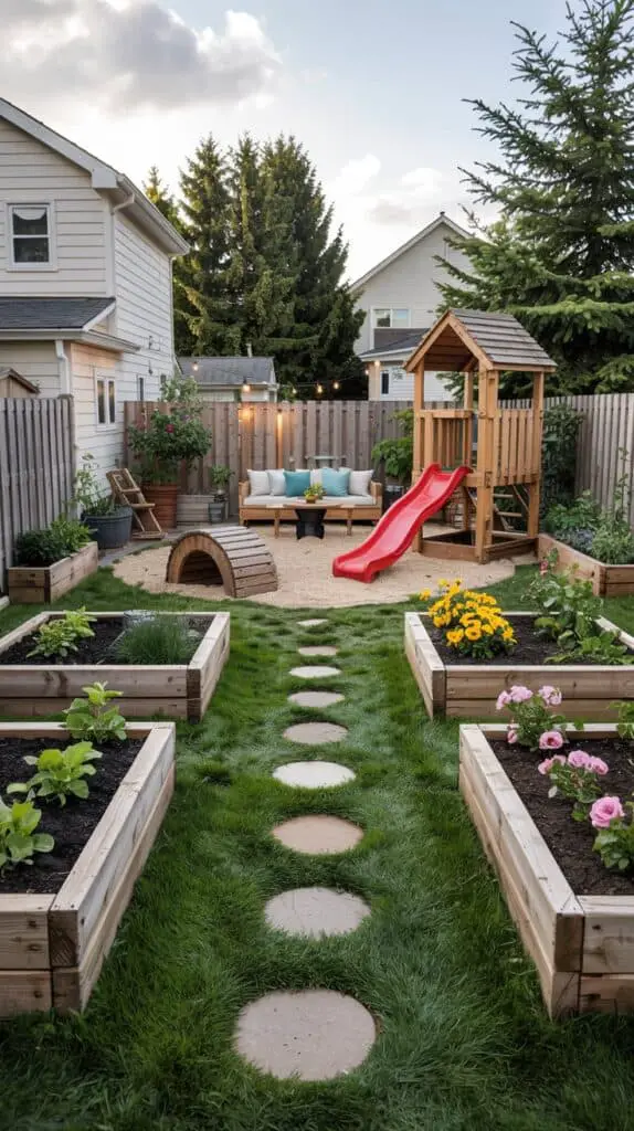 An Ideal Backyard Layout With Raised Beds and a Central Play Zone