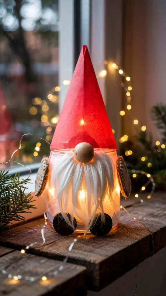 This one starts with an old jar and ends with something magical glowing on your shelf. Grab a clean glass jar (jam jars, pickle jars — anything with a nice shape), and wrap a paper cone around the top to become the gnome’s hat. Paint the inside of the jar with a frosted whitewash or glue a bit of tissue paper inside for a soft glow. Add a cotton ball or pom-pom nose just peeking out from under the hat brim, and glue a beard made from white yarn, faux fur, or crinkled paper down the front.