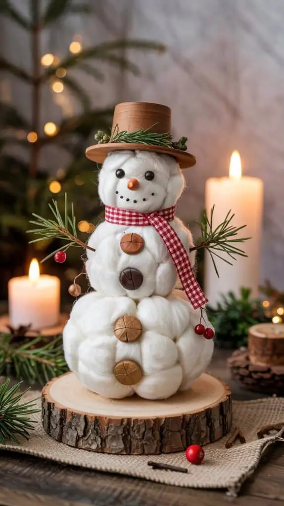 Forget the classic round snowman — this one’s all about mixing textures. Start with three soft cotton balls or felted wool for the body. Stack them gently on a wooden slice or flat stone, then use bits of bark, acorn caps, and dried moss to make hats, scarves, and arms. A tiny twig or clove makes a perfect nose. If you want a touch of colour, press in a few red berries or thread a gingham ribbon through his middle.