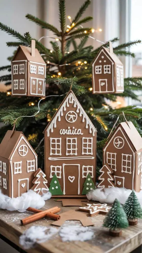 You don’t need real gingerbread to get the look — just brown craft paper, glue, and a white paint pen. Cut and fold small houses from card or thick paper, then decorate them like you would a real cookie house: scalloped roofs, snowy windows, and swirly hearts on the door. Add cut-out trees or stars and tape them to a string of fairy lights for a glowing winter street scene.