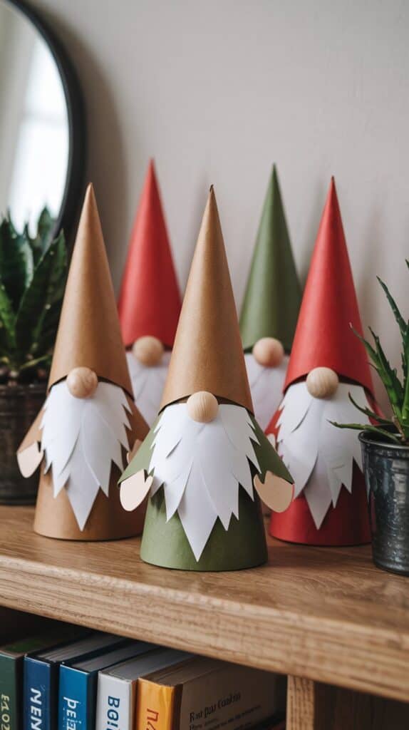 You only need some thick paper or card, scissors, and a little imagination. Cut large triangles from paper and roll them into cones for the hats. Make simple tube bodies, glue on white beards cut from tissue or fluffy cotton, and add little round noses from beads or buttons. Use soft colours — oatmeal, grey, forest green — or let the kids go bold with red and gold.