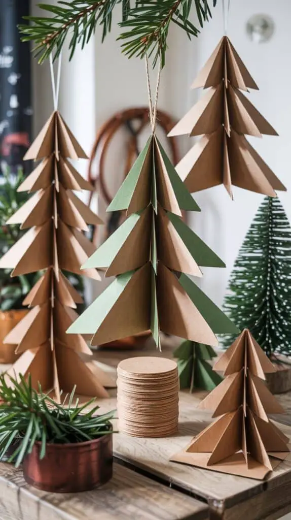 This one’s especially good if you’ve got cereal boxes or cardboard packaging you don’t want to just throw out. Cut out several tree shapes in gradually smaller sizes and stack them together with glue or double-sided tape. You can mix colours — like kraft paper, old wrapping paper, or even pages from magazines — for a more playful look. Fold each layer slightly in the middle to give the tree some dimension.