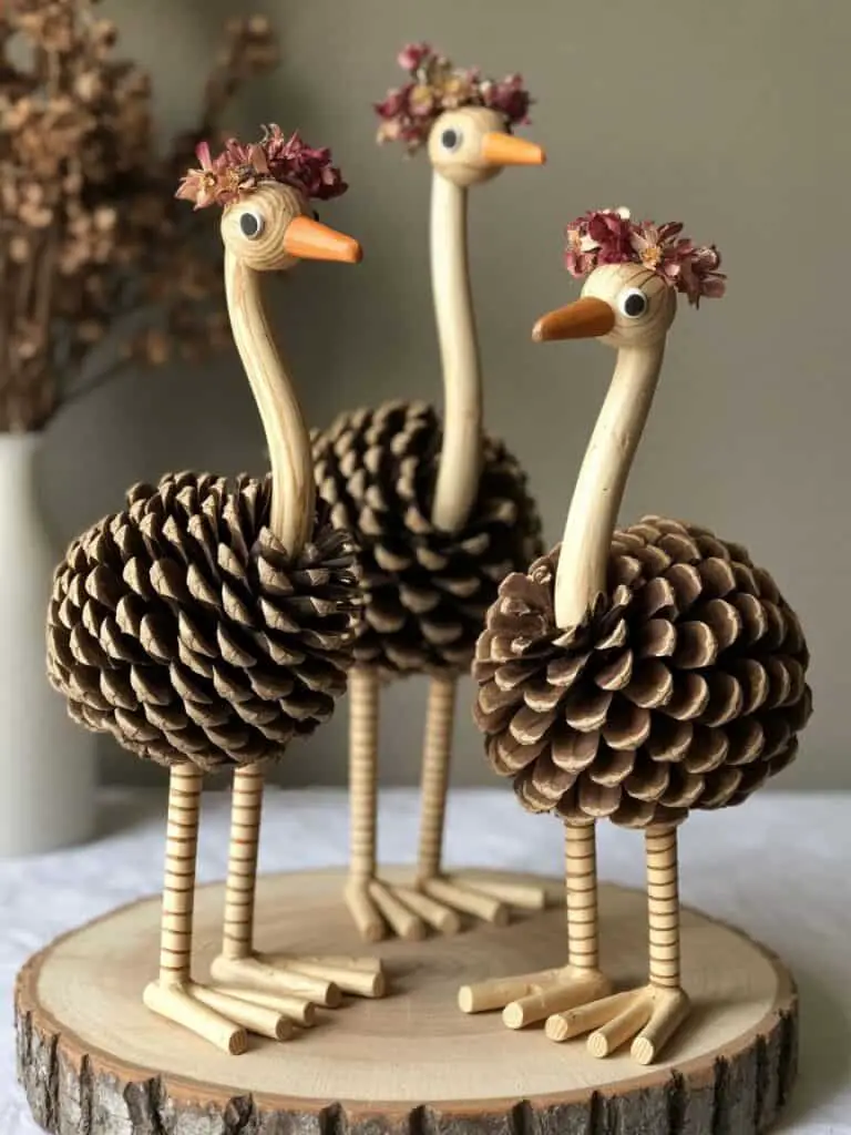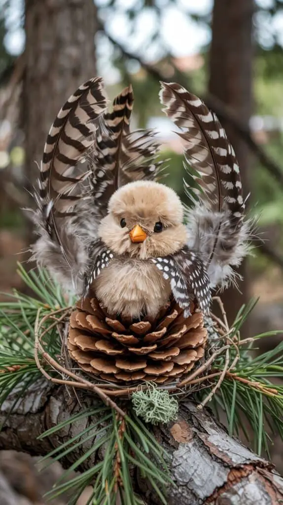 - What you need: One large pine cone, feathers in natural colors (browns, grays, creams), faux moss or Spanish moss, and small twigs for a nest. Add a soft pom-pom head and bead eyes.