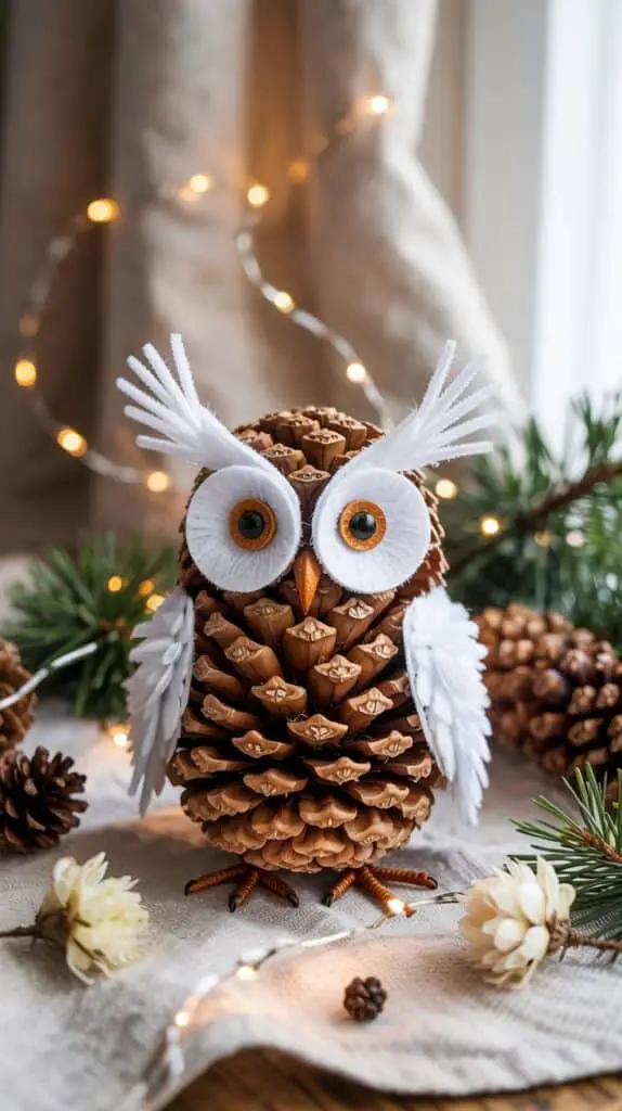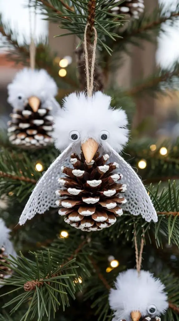 - What you need: Bleached pine cones (or white-painted ones), white cotton balls or polyester fiberfill, googly eyes, and a tiny black felt beak. Add white felt wings or use lace for a fancier look.