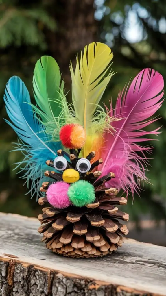 - What you need: A pine cone, feathers in various bright colors, googly eyes, and a pom-pom for the head.