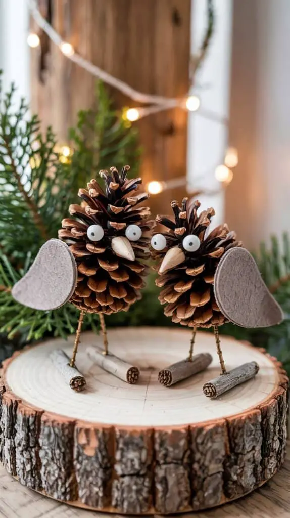 - What you need: Two small pine cones, driftwood pieces for legs or tails, small beads for eyes, and neutral-toned felt for wings.