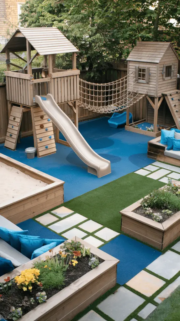 Opt for natural wood, stone pathways, and soft rubberized flooring to keep the area safe and visually appealing. Adding a splash of color with outdoor cushions and garden planters keeps things fun without overwhelming the space.