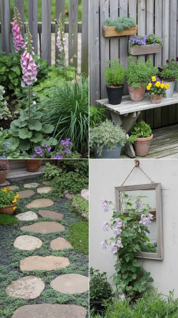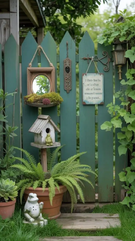 Sometimes the charm of a secret garden comes down to the tiny unexpected things — a little mirror hung on a fence panel, an old birdhouse half-covered in moss, or a frog statue half-hidden under ferns. Choose just one or two pieces and let them peek out from behind plants or perch near the end of the path.