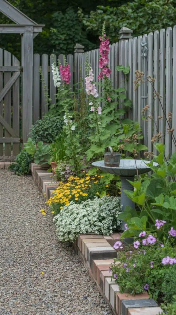 Start with the fence — even if it’s not in great shape. You can soften it completely with a layered flower bed running the full length, edged with brick, wood, or stone. Add height at the back with hollyhocks, foxgloves, or even tall grasses, and work your way forward with mid-size plants like salvias, heuchera, or flowering sage. Use smaller low growers like alyssum or creeping thyme near the path.