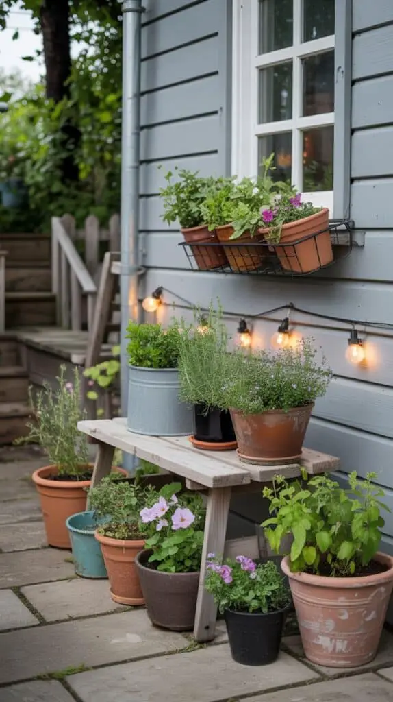 Nothing says “there’s something special here” like a bench, even if no one ever sits on it. A small weathered wood or metal bench tucked against the side of the house creates an anchor point for the space. Surround it with mismatched pots — some terracotta, some glazed, some painted by your kids — filled with herbs, trailing lobelia, pansies, or miniature roses.