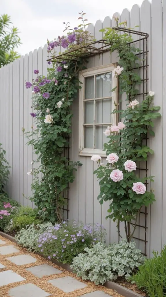 This is the move that takes your side yard from “functional” to “storybook.” Pick one climbing plant — a pale pink rose, a deep purple clematis, even jasmine if you’re in a milder spot — and train it gently along the wall or fence using wire or a trellis. You don’t need full coverage. Just a few trailing vines and blooms will soften the entire path.