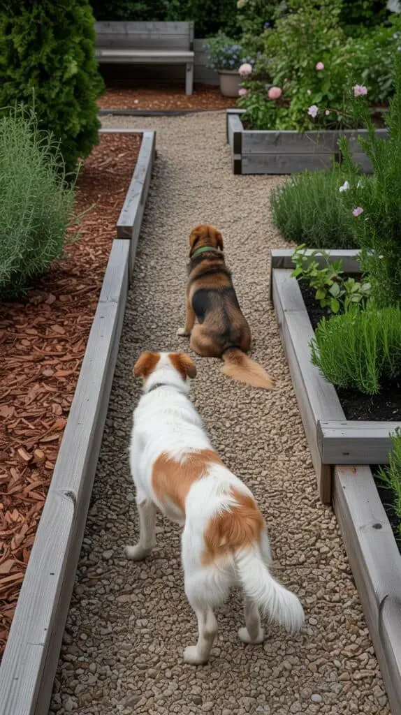 Try laying down gravel or bark mulch paths that guide pets away from your garden zones. These soft boundaries make it clear where feet should go (and where they shouldn’t). You can even edge these paths with low wood beams, pavers, or bricks for definition.
