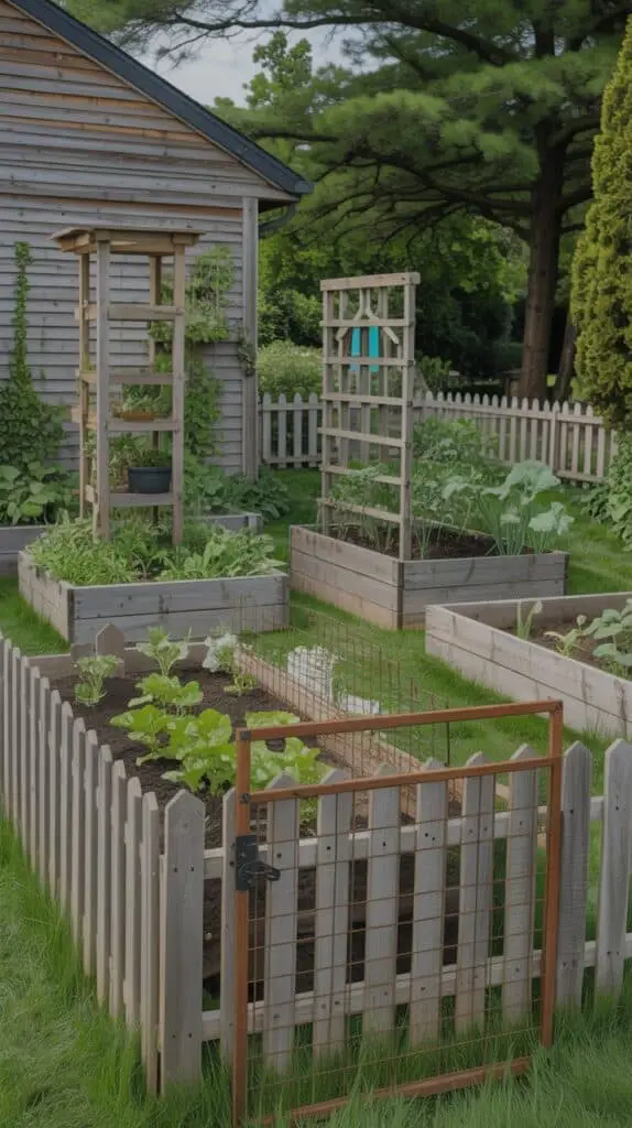 Match your materials to your garden vibe—weathered wood for a rustic look, black powder-coated metal for a clean modern feel, or whitewashed pickets for a cottage-style yard. This keeps the space looking cohesive while protecting your precious greens.