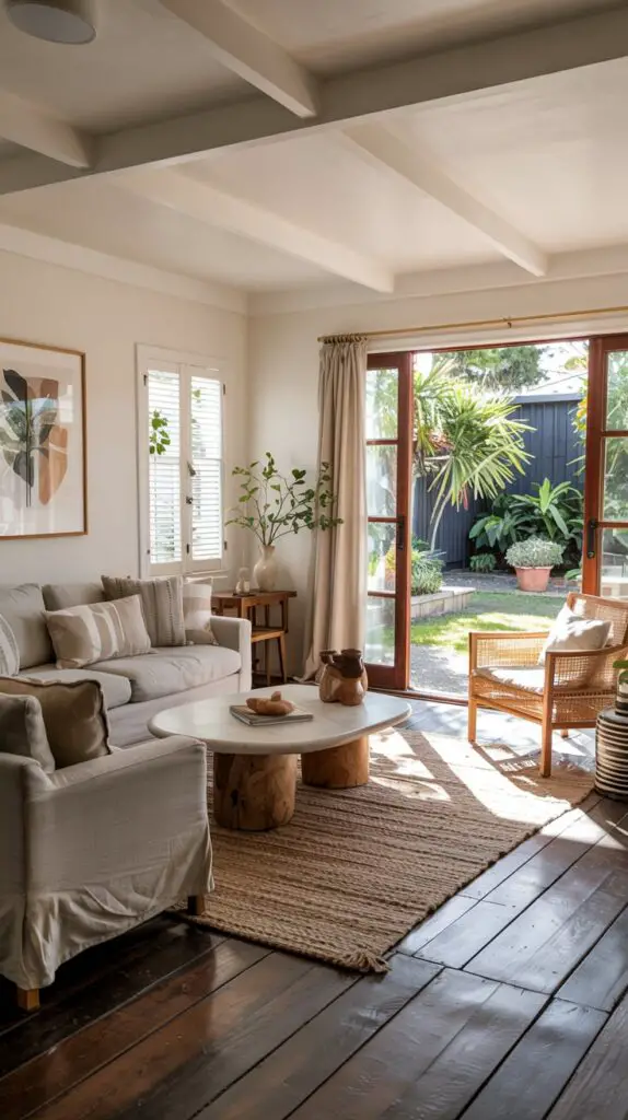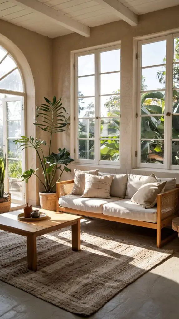 The key to this style is warmth through simplicity. Choose neutral tones like soft beige, oatmeal, and clay, and add texture with woven baskets, jute rugs, or rattan chairs. Large glass sliding doors open onto a covered patio or pergola, blending indoor comfort with outdoor living.