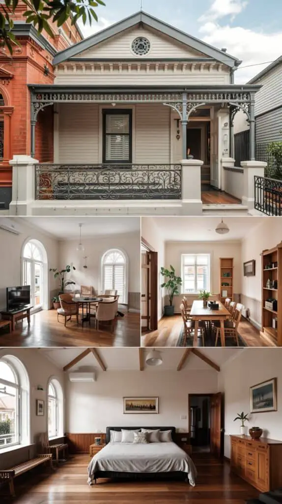 Inside, think heritage character mixed with modern Australian interiors: original fireplaces beside sleek kitchen islands, decorative ceilings above minimalist pendant lights. The beauty lies in contrast—keeping the charm while removing the fuss.