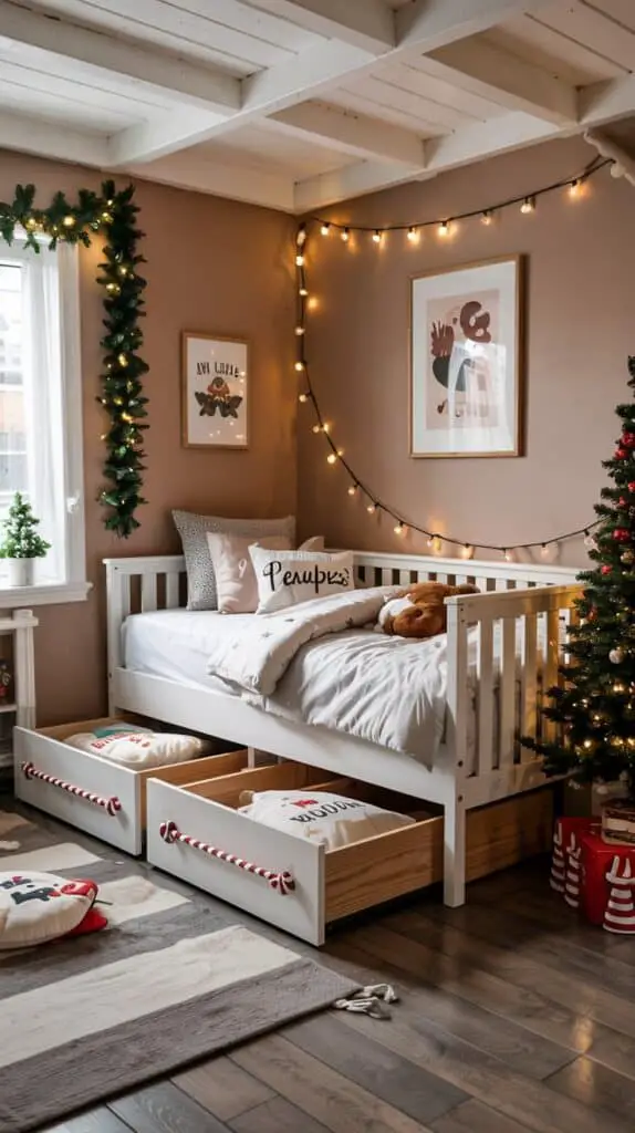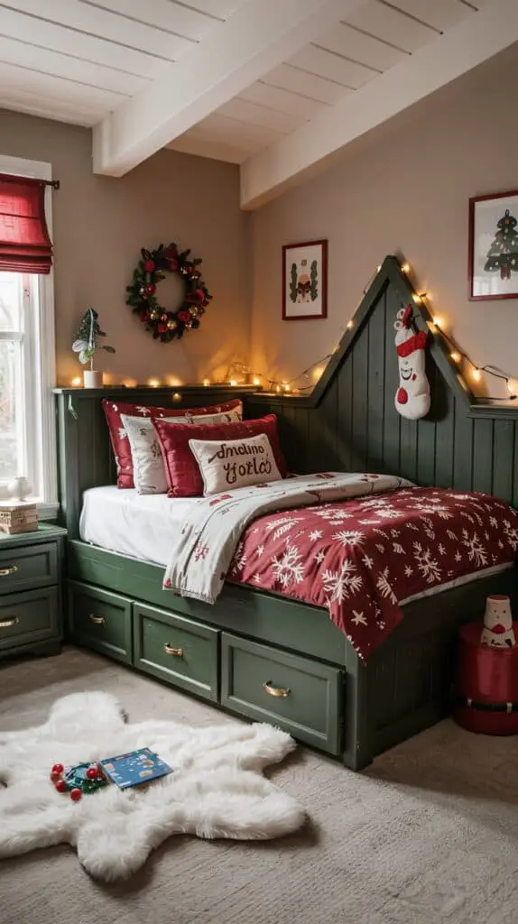 For small rooms, the built-in bed with drawers is the unsung hero of holiday design. Imagine a snug single bed tucked against one wall, surrounded by soft red-and-cream bedding, with drawers underneath to hide toys, blankets, or those oversized plush Santas your kid refuses to let go of. Paint the frame a warm evergreen or cranberry red for a seasonal look that still works year-round. A garland of fairy lights along the headboard instantly adds that Christmas glow without taking up any extra space. You can even slip in removable decals—snowflakes or candy canes—that peel off easily when January hits.