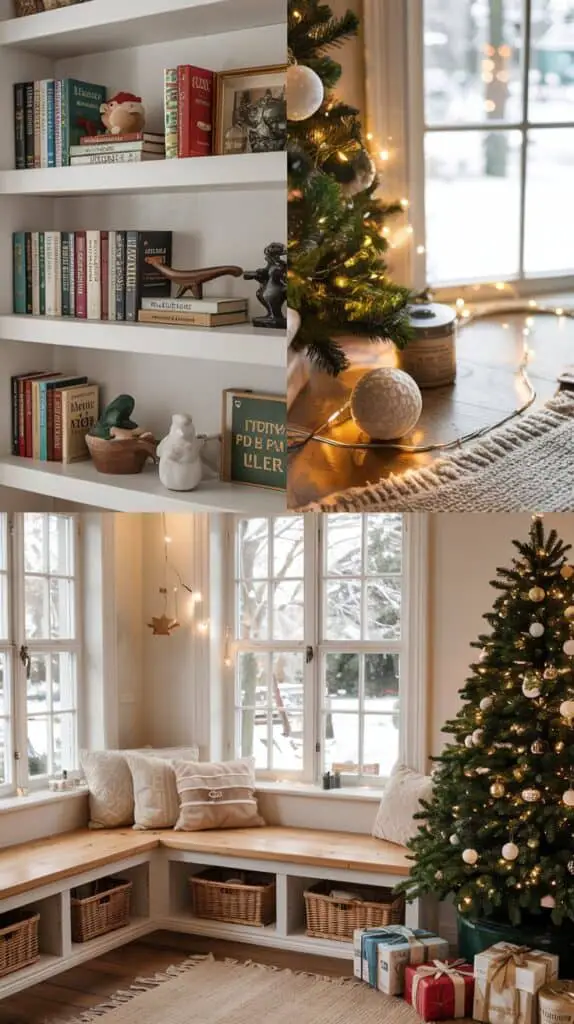 Small rooms demand clever thinking, and a kids’ bedroom with built-in storage is a dream come true during the holidays. Install shelving around the door frame or above the bed to display Christmas books, tiny trees, or battery-lit ornaments. Soft woven baskets below can hold extra pillows, toys, or wrapping supplies. A built-in corner bench with hidden storage underneath can be a reading nook by day, Santa letter-writing station by night.