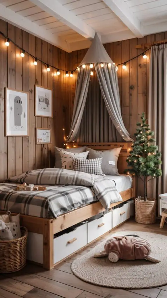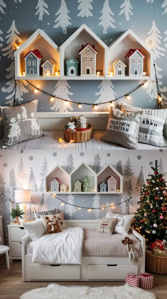 Add small rustic shelves for displaying pinecones, reindeer figurines, or the kids’ handmade ornaments. Even a mini artificial tree in a woven basket at the end of the bed can make the space feel magical. Think less over-the-top Christmas décor and more storybook charm. It’s about warmth, texture, and clever layering—the kind of room kids will remember long after the snow melts.