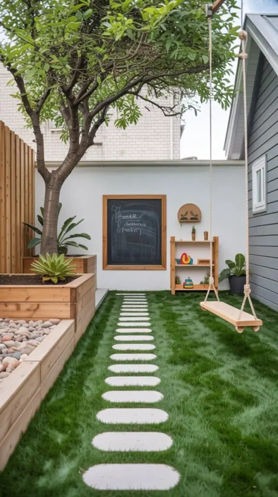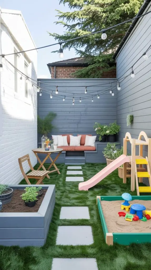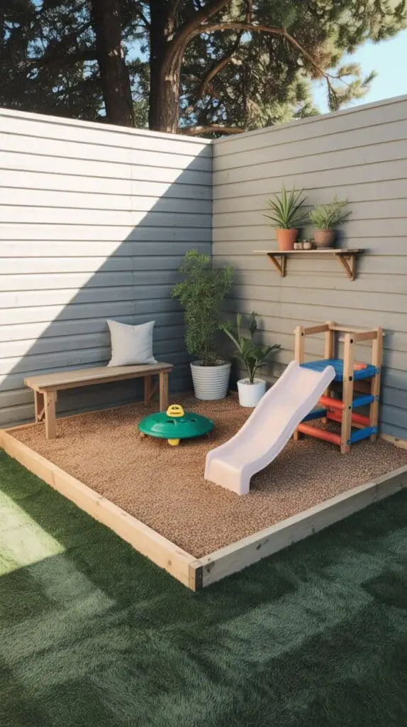Start by choosing one clear corner for the play area. Not the middle, not the front, one corner. Add a small wooden play structure or just a simple slide and sand table. Create a “kid zone edge” with stepping stones, a raised bed, or a DIY turf square that sets the boundary visually without using fencing.