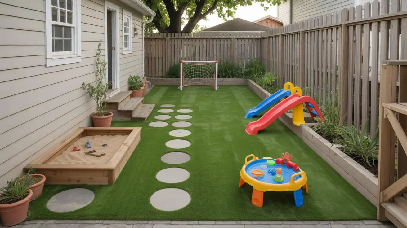 A Side Yard Kids’ Play Area With Turf for Low-Maintenance Fun