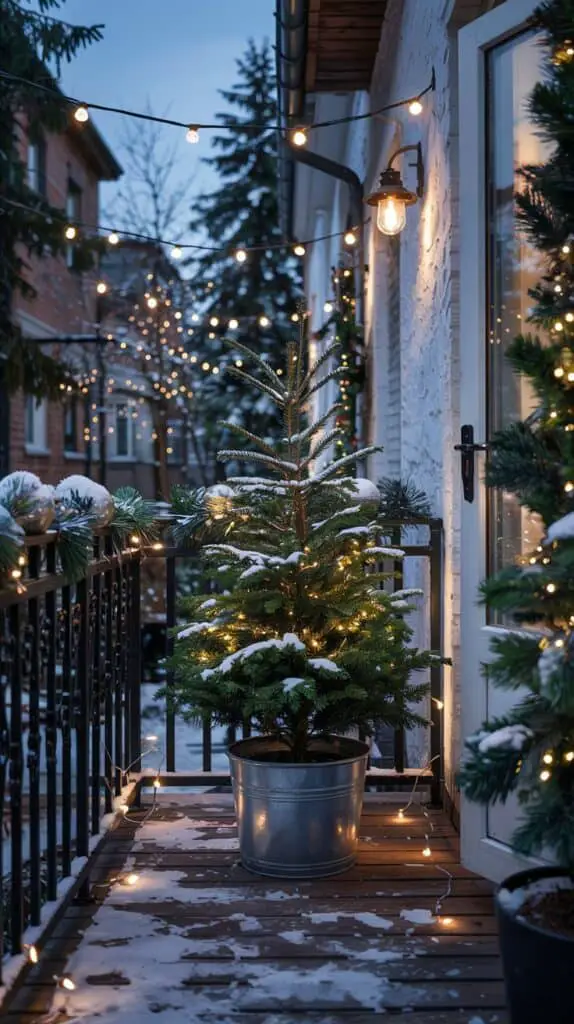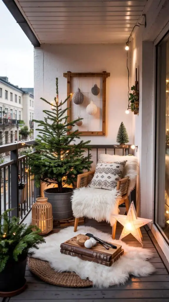 Try a single potted fir tree, a sheepskin throw, and one strand of fairy lights. Add a wooden lantern or a star-shaped light to complete the look. The goal here isn’t more decoration—it’s balance. Even a very small balcony can feel luxurious when it’s neat, intentional, and softly lit.